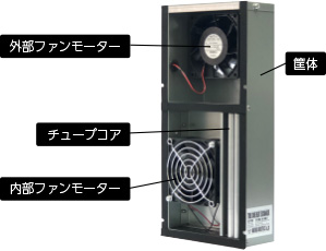盤内の温かい空気を、内部ファンモータによりチューブ(パイプ)内面に強制循環し、盤外の冷たい空気を、外部ファンモータによりチューブ(パイプ)外面に強制循環します。この連続運転によって温度差を融和し、盤内の温度上昇を抑えます。